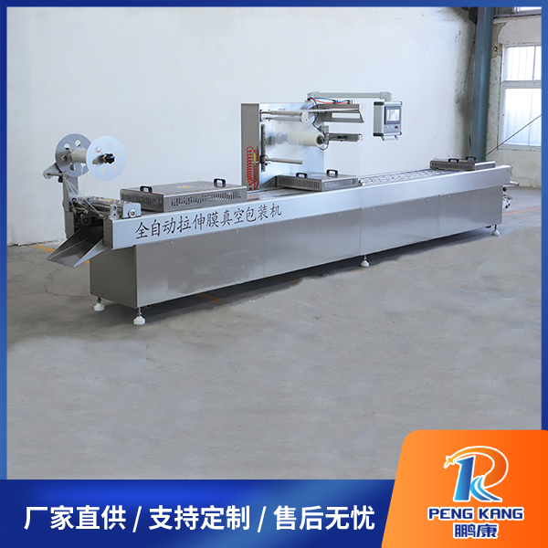 全自动拉伸膜真空包装机的工作原理是通过下膜拉伸成型,然后将产品放入成型了的下膜腔中,接着在抽真空区对产品进行抽真空,并将上膜与下膜热合,再通过横切、纵切将产品进行分割,然后包装的成品输送到下一工序,余下的废膜料会进入废料回收桶。