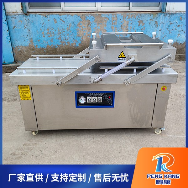 双室真空包装机由上工作室、下工作平台、机架、电器系统、真空系统五部分组成.工作原理:首先将包装物放置在工作平台上,将包装袋袋口平铺在硅橡胶条上,并用包装袋压条压住袋口。打开电源,选择加热温度,以及调整好抽气时间和加热时间,合盖后,包装机即可自动完成抽气-封口-冷却-起盖系列连续动作。