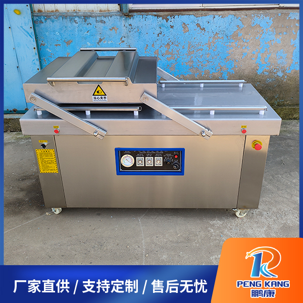 双室真空包装机由上工作室、下工作平台、机架、电器系统、真空系统五部分组成.工作原理:首先将包装物放置在工作平台上,将包装袋袋口平铺在硅橡胶条上,并用包装袋压条压住袋口。打开电源,选择加热温度,以及调整好抽气时间和加热时间,合盖后,包装机即可自动完成抽气-封口-冷却-起盖系列连续动作。
