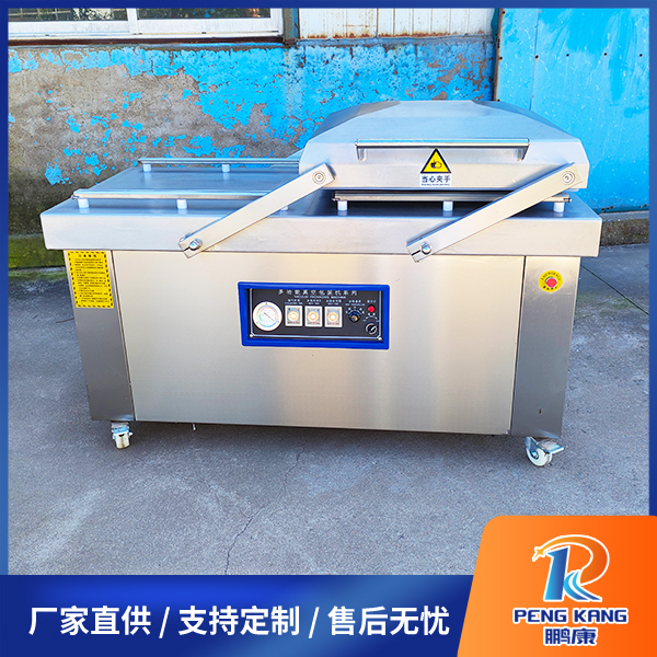 双室真空包装机由上工作室、下工作平台、机架、电器系统、真空系统五部分组成.工作原理:首先将包装物放置在工作平台上,将包装袋袋口平铺在硅橡胶条上,并用包装袋压条压住袋口。打开电源,选择加热温度,以及调整好抽气时间和加热时间,合盖后,包装机即可自动完成抽气-封口-冷却-起盖系列连续动作。